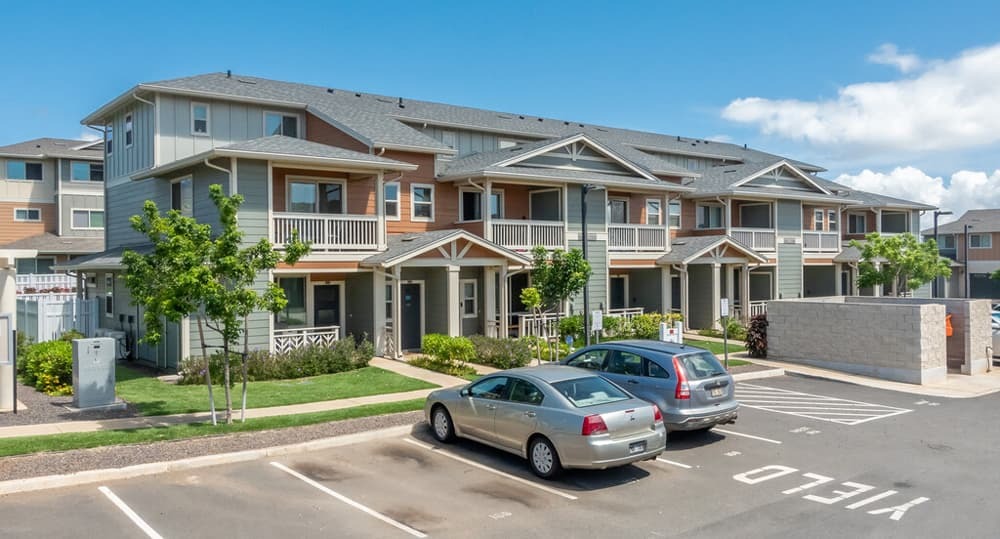 Akoko is a neighborhood within the Hoopili community that offers 1-3 bedroom, 1-2.5 bathroom flats and townhomes. Floor plans are diverse to meet the needs of different family sizes, with units ranging from 749 square feet through 1,519 square feet. Some of the units are single-level, while others are split-level. Most of the homes include 2 parking stalls for resident vehicles, though the neighborhood is so walkable, it’s unlikely you’ll need to use a car for your day-to-day activities!