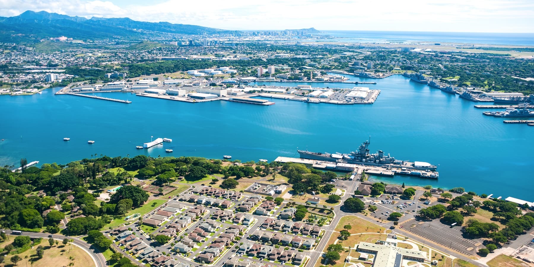 The shallow waters of Pearl Harbor, known as Wai Momi (“Waters of Pearl”) to the Hawaiians, once bore oysters filled with magnificent pearls along with plentiful fish. In the 1880s, the mountainous areas of Pearl City were transformed to rice paddies – with cattle and water buffalos plowing the fields. After the construction of the Oahu Railway by businessman Benjamin Dillingham in the late 19th century, the sugar industry reached the then-developing neighborhood of Pearl City, providing jobs for residents in the sugar plantations and factories. In 1899, the United States Navy established the Pearl Harbor base, and in 2010, joined Hickam Air Force Base to create the now Joint Base Pearl-Harbor Hickam.