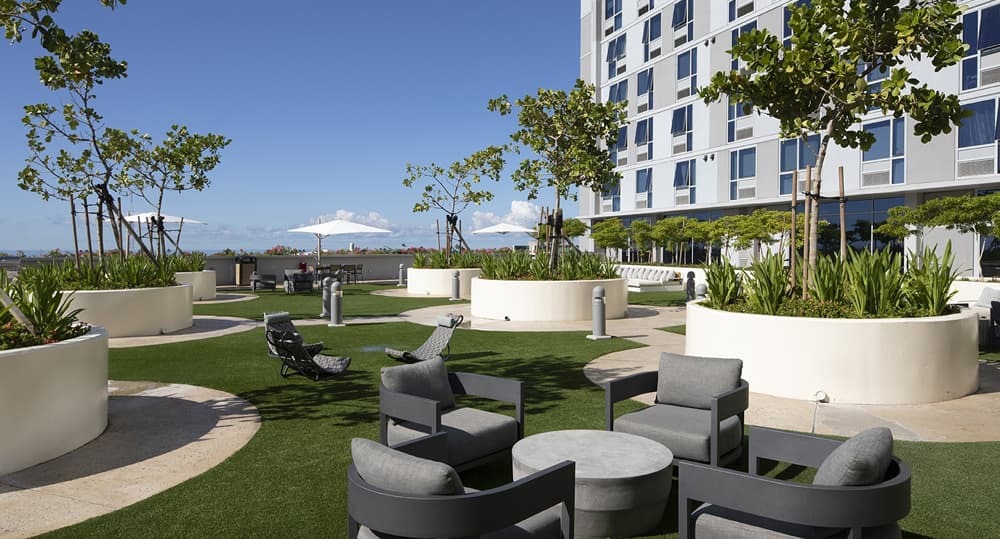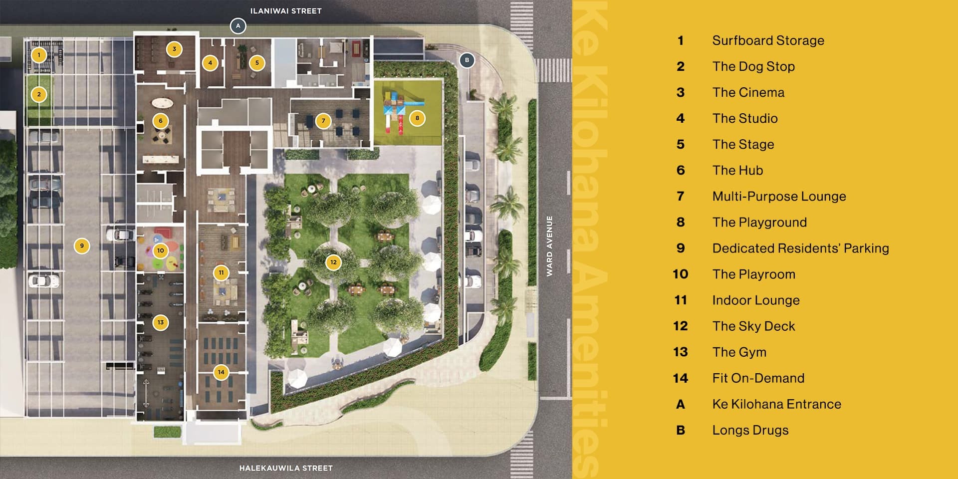 Residents at Ke Kilohana have access to a variety of shared amenities that mimic many of the luxuries found at other high-rise developments in the area. The condo’s main attraction is the Skydeck, located above the garage (which includes parking stalls for residents and their guests). From the deck, residents can enjoy incredible views of the ocean, the city, and the mountains.