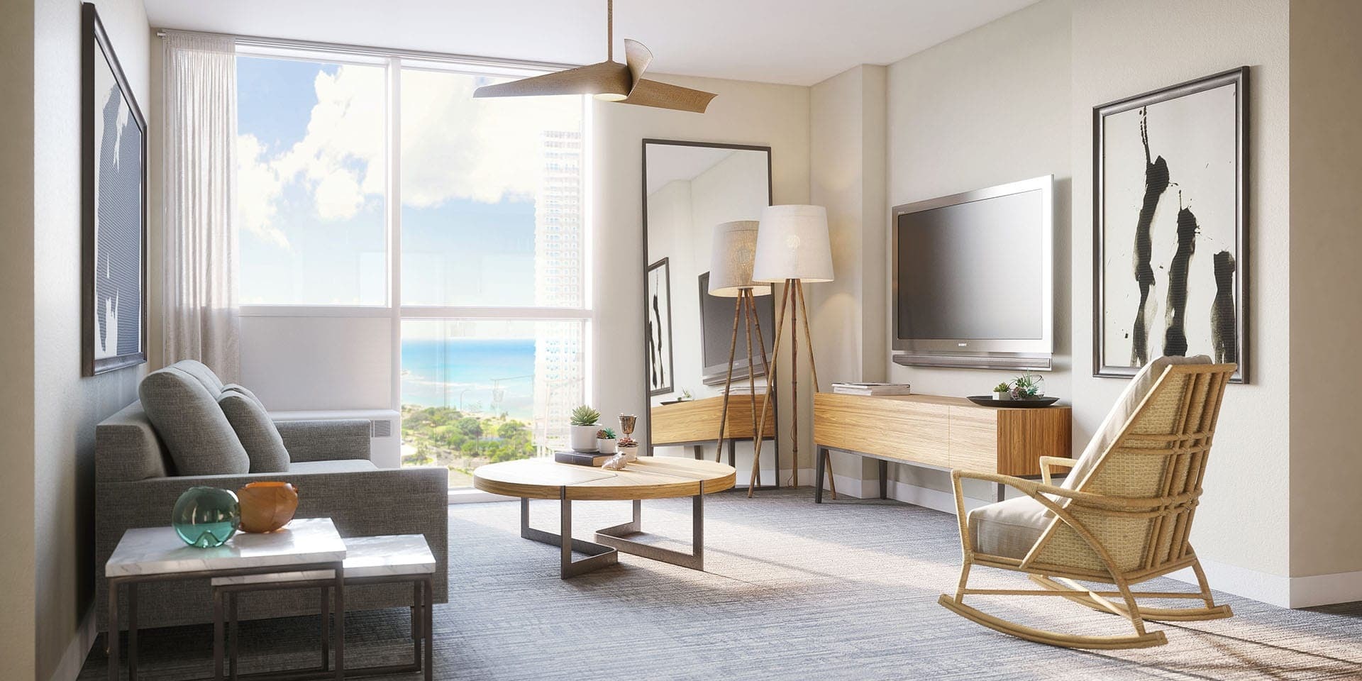 Ke Kilohana offers units ranging significantly in size, so there are opportunities for singles, couples, and larger families to find a space that fits their needs. There are a total of 141 1-bedroom units that range from 482 through 503 square feet. The 2-bedroom units (191, in total) range from 742 through 800 square feet, while the 3-bedroom units (92, in all) range from 978 through 1,173 square feet. At the top of the building, you’ll find several larger penthouse units ranging from 1,550 through 2,070 square feet. Unit prices were originally sold between $300,00 through $1,000,000.